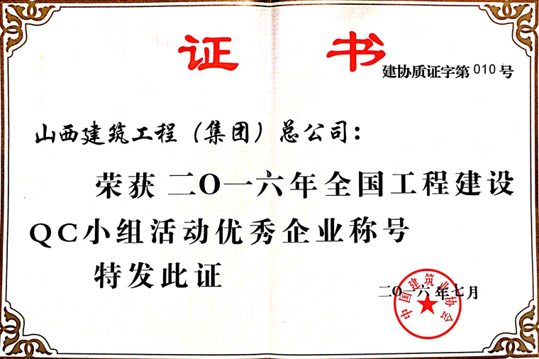 荣获2016年全国工程建设QC小组活动优秀企业称号